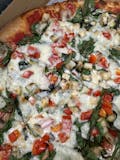 Tomato sauce, mozzarella cheese, baby spinach, roasted peppers, roasted squash & zucchini.