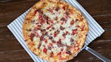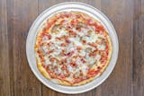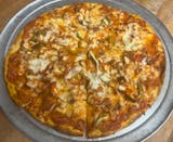 Created on Arthur Avenue this pizza is made with vodka sauce, chicken cutlet and cherry peppers then topped with mozzarella cheese.