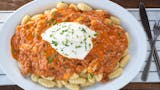 Orecchiette pasta is prepared in our famous spicy vodka sauce covered in crumbled Italian sausage and fresh arugula.