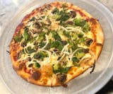 Topped with broccoli, fried eggplant, mushrooms, peppers, olives, onions, spinach, tomato sauce and mozzarella cheese.