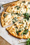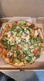 Perfect for whose who like a bit of spice! This WHITE pizza comes with Buffalo sauce, Bleu Cheese and Chicken.