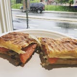 With eggplant, onions, roasted peppers, feta cheese, yogurt dressing served on house-made bread