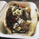 Chicken marinated with onions, garlic, turmeric, paprika & preserved lemons with lettuce, tomatoes, artichokes, feta cheese & yogurt dressing on housemade flatbread.