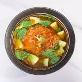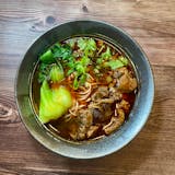 The stewed beef bone soup base, seasoned with spices to enhance the flavor, features tender and soft beef in a rich broth. Cooked noodles are combined with the beef and garnished with green onions, cilantro, diced celery and fresh vegetables.