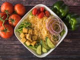 Our organic spring mix and lettuce, juicy tomatoes, onions, cucumbers, fresh green peppers, mozzarella cheese and croutons.