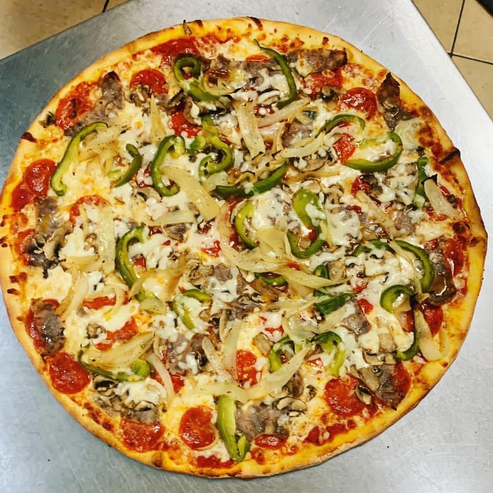Pepperoni, sausage, mushrooms, green peppers, onions, tomato sauce & mozzarella cheese.