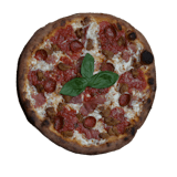 Brooklyn-style pizza topped with pepperoni, sausage, salami, prosciutto di Parma, bacon, with fresh mozzarella and imported tomato sauce.