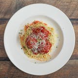 Hand-rolled blend of beef, pork, & veal, simmered in marinara and served over angel hair pasta.