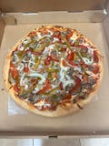 Pepperoni, sausage, onions, mushrooms, and green peppers.