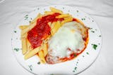 Breaded chicken and penne pasta tossed in marinara sauce and covered with cheese. Includes 2 garlic rolls. Add a side salad for $2.99.