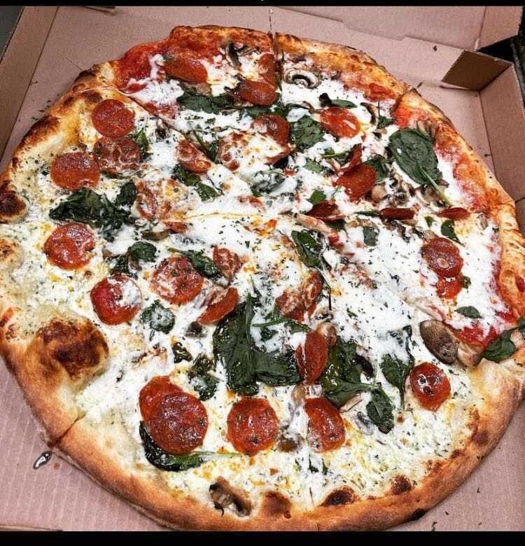 Onion, green pepper, black olives, tomatoes, mushrooms, spinach & cheese.