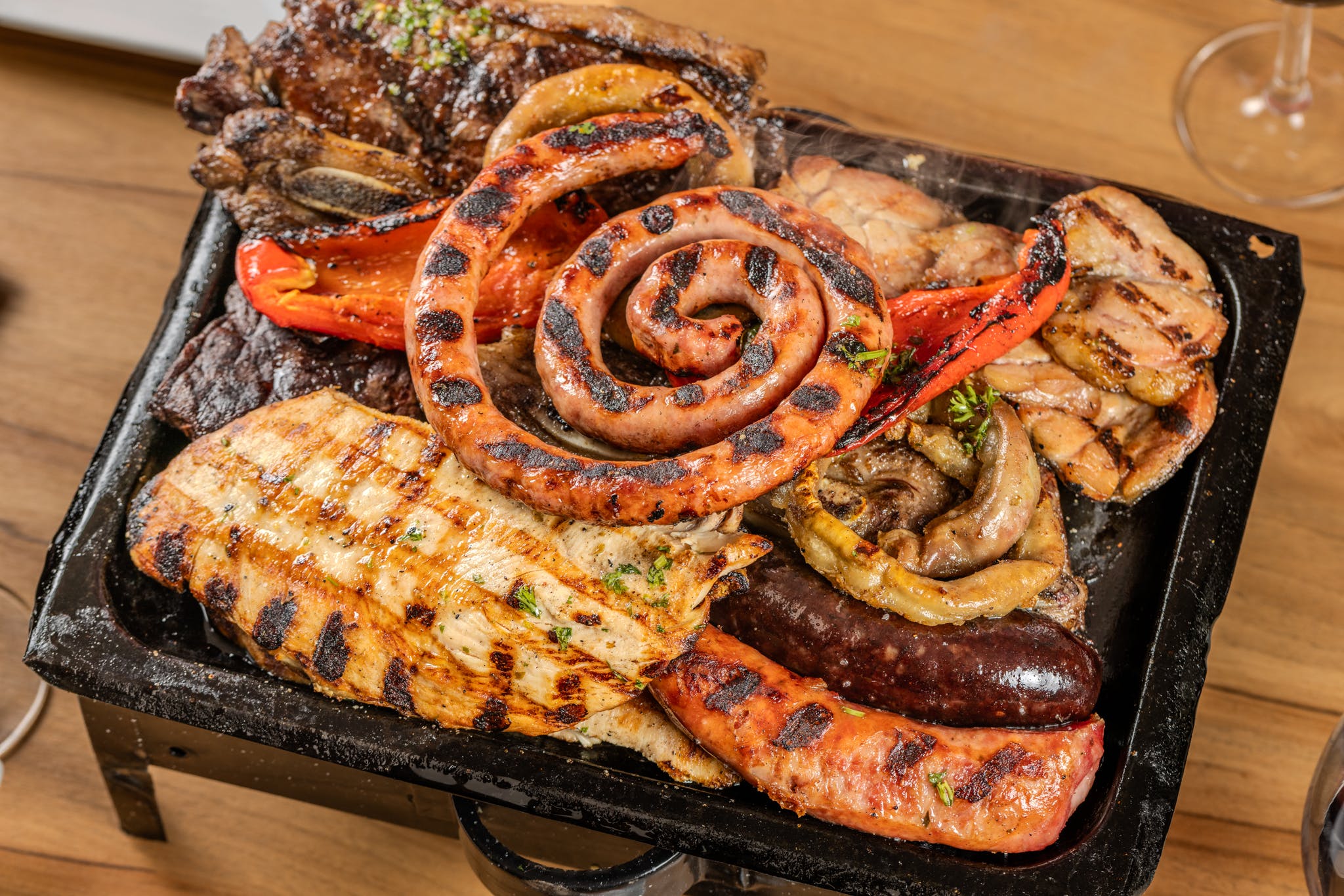BBQ. Short rib, flank, steak, chicken, sausage, blood sausage, sweetbreads, Chinchulines. Order for one come with 1 short rib & order for two comes with 2 short ribs. Includes choice of 2 sides.