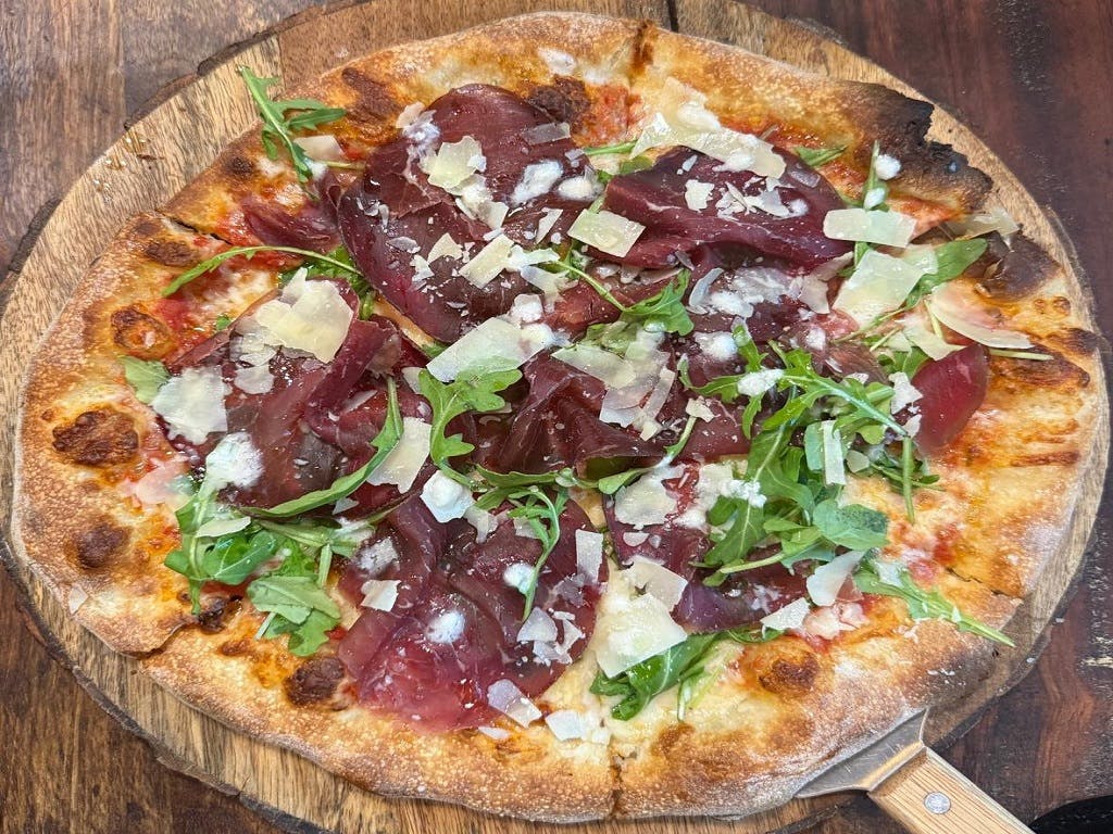 Plum tomato sauce, mozzarella cheese, carpaccio di bresaola, arugola, shaved parmesan & cream parmesan.