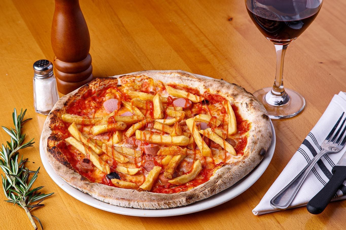 Tomato sauce, mozzarella fiordilatte, sausage, mushrooms and roasted potatoes.