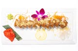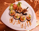 Tempura fried lobster tail rolled with asparagus, scallions, cream cheese, topped with ebi shrimp & avocado, with sweet teriyaki sauce.