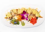 Fried soft shell crab, avocado, asparagus, scallion, masa, and tamago with sweet sauce.