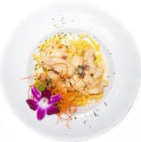 Sautéed chicken tenders, prosciutto, peas, garlic cream sauce, over house made fettuccine