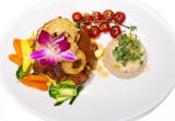Eight oz Salmon pan seared with spinach, garlic, tomatoes, artichoke hearts & mushrooming a white wine lemon butter sauce, over capellini (GF)