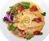 Veal pan seared with capers, artichoke hearts, sun-dried tomatoes and spinach. In a white wine lemon butter sauce over capellini.