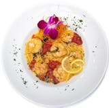 Shrimp sautéed with fresh garlic, tomatoes, basil, and a scampi white wine butter sauce over capellini