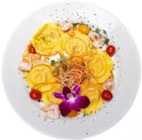 Six lobster ravioli topped with our sherry lobster bisque sauce garnished with two fantailed jumbo shrimp
