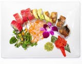 Bluefin tuna, salmon, white fish (escolar), avocado, hamachi on top of our California roll.