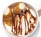 A scoop of vanilla gelato or ice cream "drowned" with a shot of hot espresso and topped off with a house made cannoli.