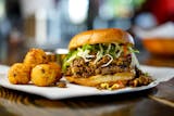 Brisket smash burger, industry BBQ smoked brisket piled high on top of the patty, smoked pimento cheese, lettuce tomato onion, on toasted brioche with our handcut fries.
