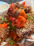 Gluten-free. Smashed & crispy fried Yukon gold potatoes, smoked pimento cheese, pork shoulder bacon, scallions, hot honey, Served with 'bama sauce on the side.