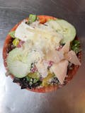 Same as our Dad Bod, but an individual portion size. Crispy lettuce, fresh mozzarella, tomatoes, pickled red onions, banana peppers, Italian olives, fancy slicer salumi, fresh pizza bone croutons, house red wine vinaigrette (on the side).
