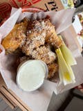 Fried and wood-fired pizza dough, garlic butter and parmesan. Served with a side of our cheesy parmesan queso and our house marinara.