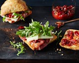 Arugula, toasted ciabatta with a black olive spread. Drizzled with a balsamic sauce.