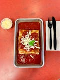 Lasagna topped with classic cheese, tomato sauce, and ground beef.