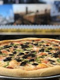 Tomato sauce, mozzarella cheese, red onions, green and red peppers, fresh tomatoes, mushrooms, and black olives.