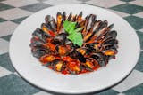 Sweet and rich mussels cooked in a tomato white wine sauce.