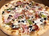 Pepperoni, sausage, meatballs, bacon, green peppers, mushrooms, onion, and black olives.