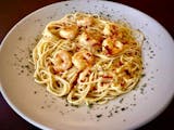 Shrimp, lemon butter sauce and garlic with spaghetti.