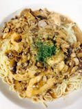 Spaghetti with chicken tender, marsala sauce, garlic, and mushrooms.