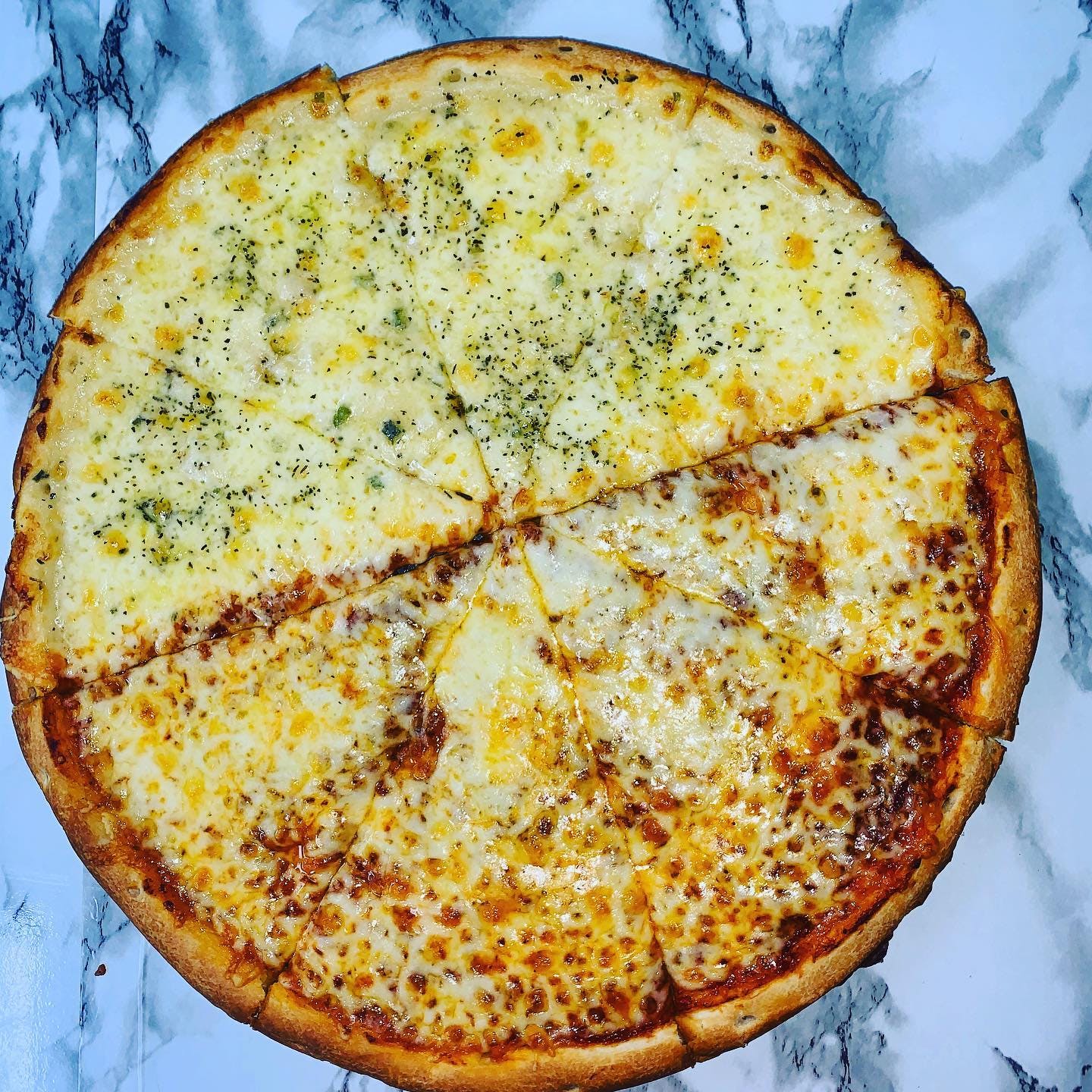 Creamy Alfredo sauce, Parmesan Cheese, and Mozzarella Cheese.