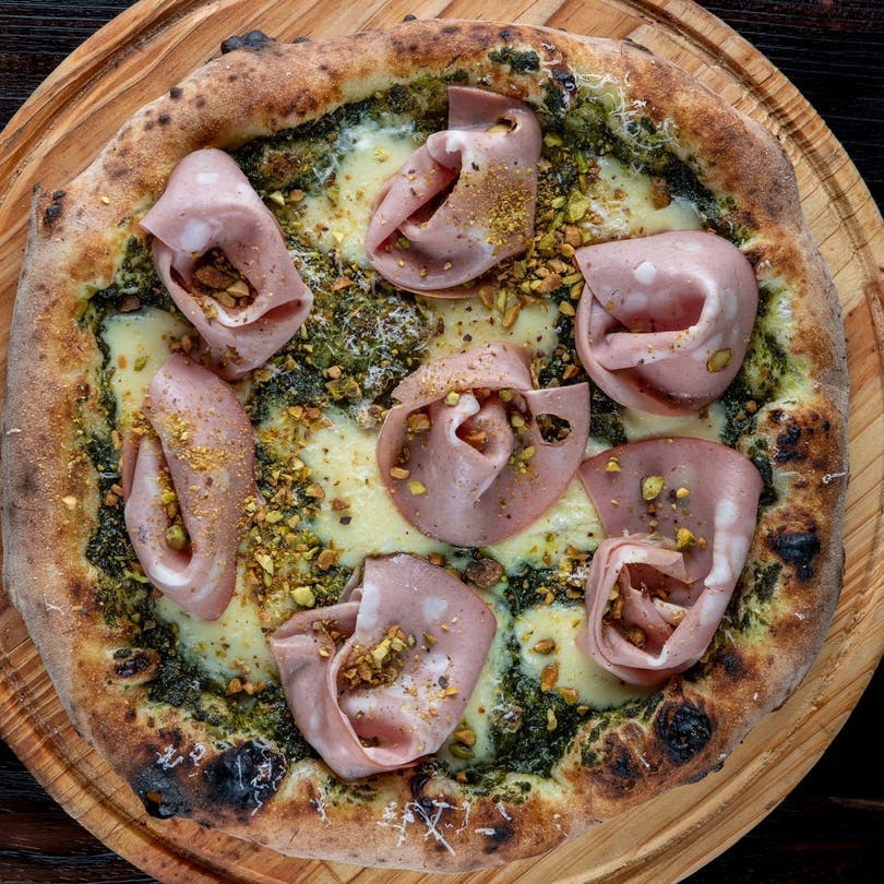 Mortadella pistachio , stracciatella, pancetta, green peppers.