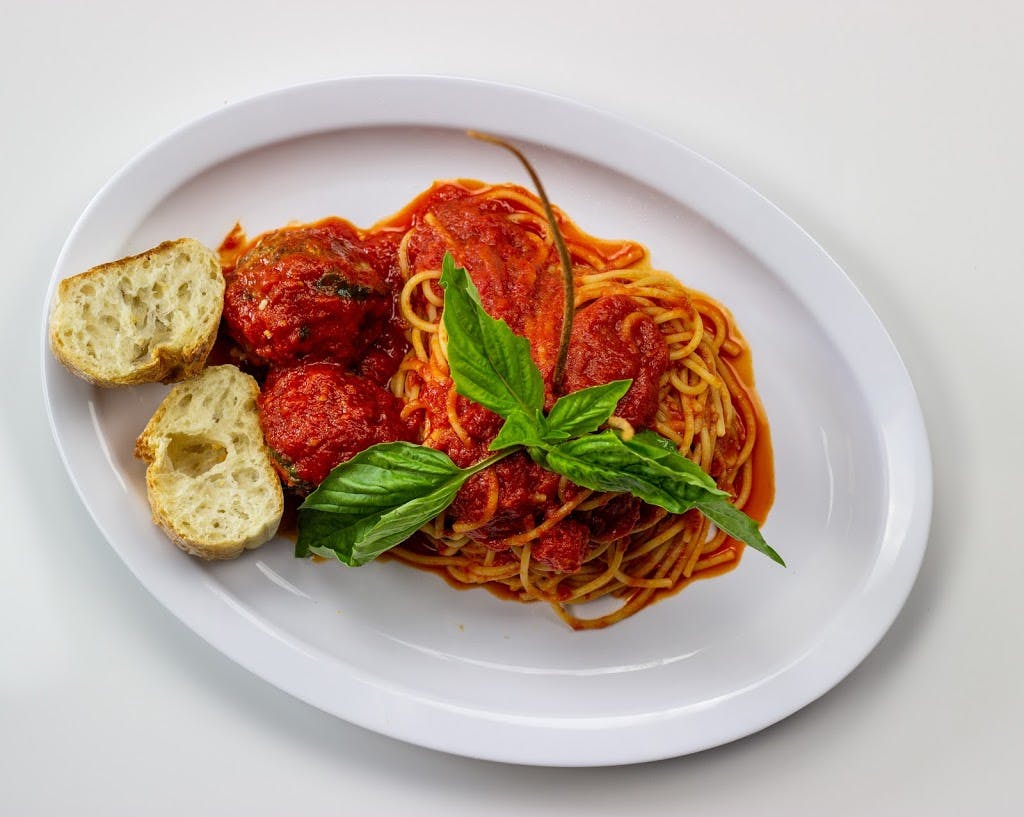 Spaghetti tossed in Maria's homemade tomato sauce topped with 2 freshly baked meatballs & fresh basil.