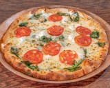 A delicately delicious pie w/ white sauce, mozzarella, romano, ricotta, spinach & tomato
