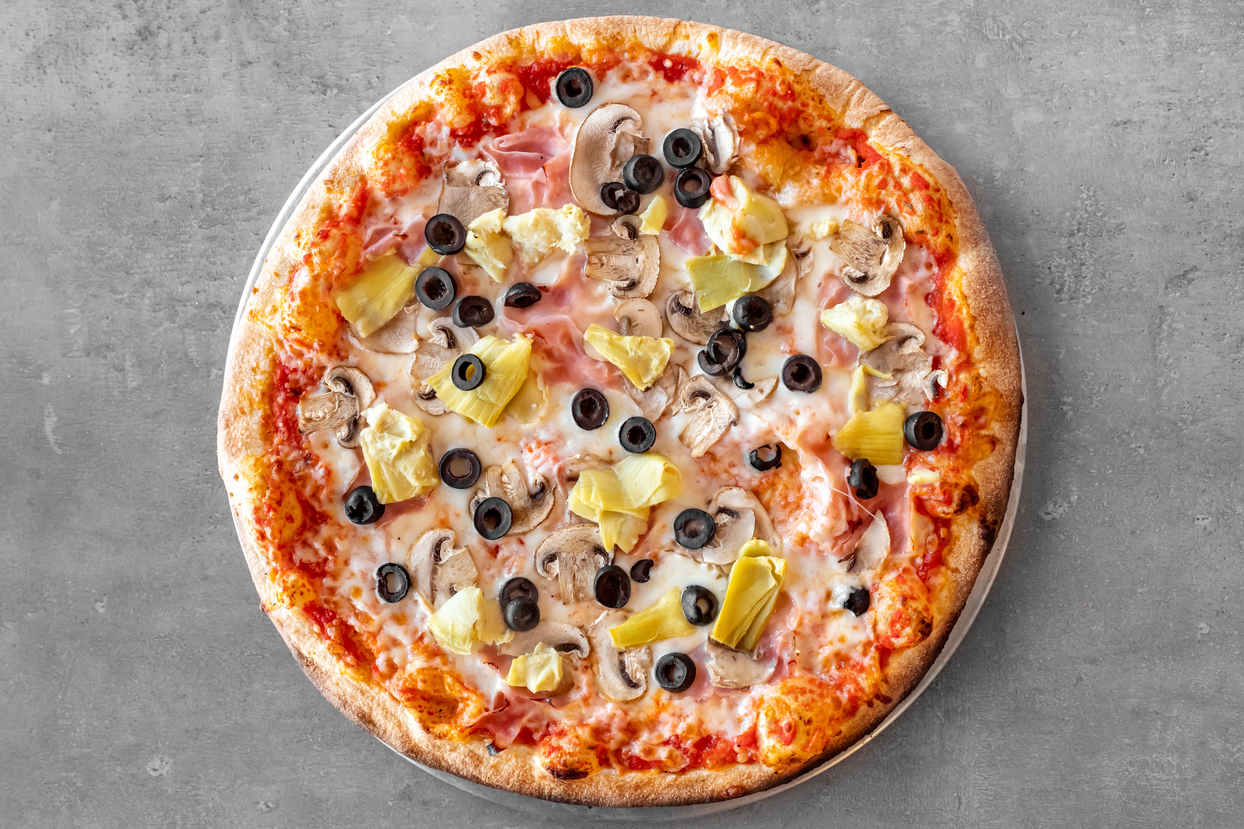 Ham, mushrooms, black olives, artichoke hearts, mozzarella cheese, and our special tomato sauce.