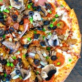 Our Premium red sauce on your choice of crust then loaded with pepperoni, beef, sausage, ham,bell peppers, onions, mushrooms, black olives, smothered with mozzarella and topped with crispy bacon.