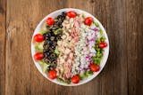 Romaine & iceberg lettuce, spinach leaves, green pepper, red onion, black & green olives, pepperoni, Canadian bacon, grape tomato, Mozzarella cheese & shaved Asiago cheese.