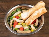 Fresh chopped romaine lettuce covered with fresh tomatoes, mozzarella cheese, ham, our signature smoked chicken breast coated in our special rub, and topped with crispy bacon. Served with two breadsticks.