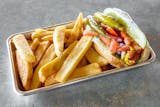With french fries. Ketchup mustard onion relish pickle sport pepper celery salt cucumber tomatoes