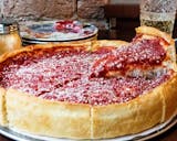 The stuffed pizza is 2 1/2 inches high and features two layers of crust stuffed with cheese and toppings and covered with our perfectly spiced sauce. Serves 2-3.