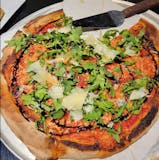 Tomato sauce and mozzarella finished with arugula, shaved parmesan, and balsamic drizzle.