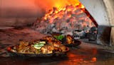 White olive oil pizza with Italian sausage, caramelized onions, wild mushrooms, mascarpone, and mozzarella.